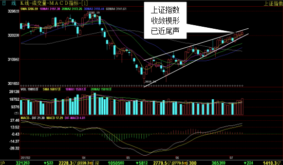 2017年7月10日股市浪形解析:今日大盘小幅低开后走出震荡行情,上证指数在最近的四个交易日中高点不断提升,今天盘中创出新高3223点。从波浪形态上看,上证指数5月24日至今的走势近似一个上升楔形,到目前已近尾声。近日主要指数在窄幅震荡后出现阶段性调整的可能性增大。创业板指数已开启去年12月以来的第5浪下跌,未来很可能创出新低。