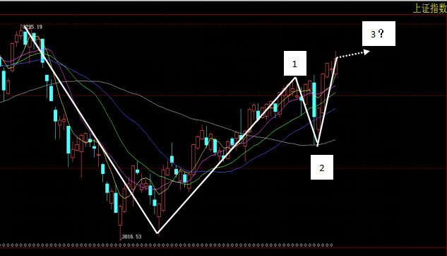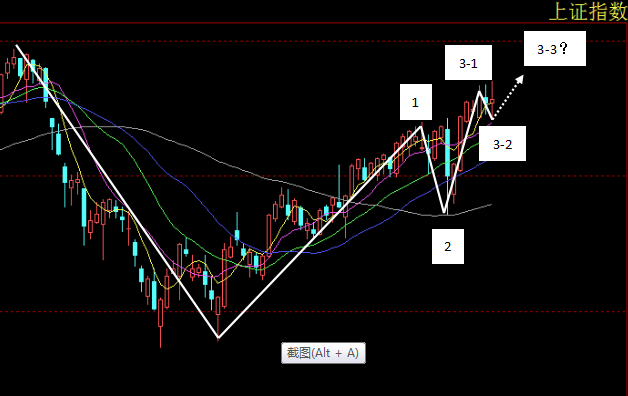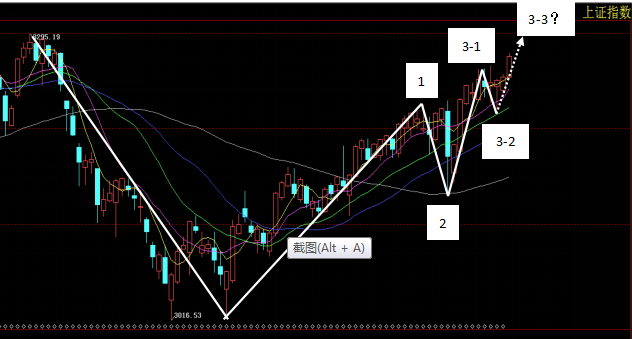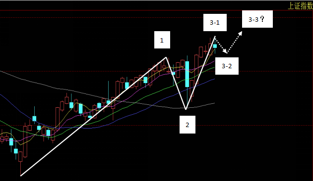2017年7月25日股市浪形解析:以上证指数分析,如果把7.17的低点到今天的高点看作3-1浪上升,那么随之而来的调整便是3-2浪,但在短暂回调到10日均线附近后,或将出现3-3浪上升。
