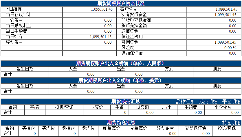 今日权益:1099501.45元 昨日权益:1099501.45元 以下表格为最近一个交易日的资金、成交、持仓情况,若需看之前的,请点击分页 阿超投资账户12月14日资金权益 以上数据来源于保证金监控中心 责任编辑:李婷 |