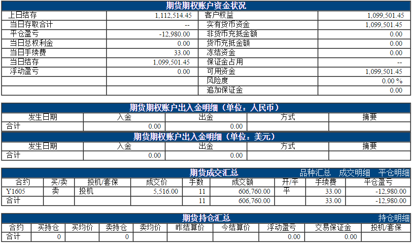 昨日权益:1105649.45元 今日权益:1099501.45元 以下表格为最近一个交易日的资金、成交、持仓情况,若需看之前的,请点击分页 阿超投资账户12月11日资金权益 以上数据来源于保证金监控中心 责任编辑:李婷 |