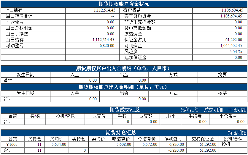 今日权益:1105649.45元 昨日权益:1109654.45元 以下表格为最近一个交易日的资金、成交、持仓情况,若需看之前的,请点击分页 阿超投资账户12月10日资金权益 以上数据来源于保证金监控中心 责任编辑:李婷 |