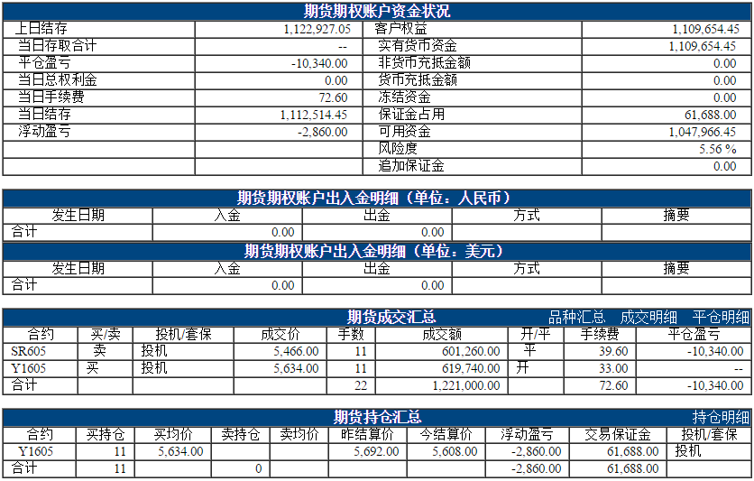 昨日权益:1118087.05元 今日权益:1109654.45元 以下表格为最近一个交易日的资金、成交、持仓情况,若需看之前的,请点击分页 阿超投资账户12月9日资金权益 以上数据来源于保证金监控中心 责任编辑:李婷 |