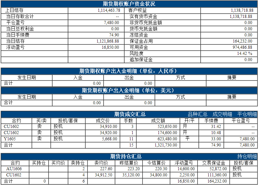 昨日权益:1132943.78元 今日权益:1138718.88元 以下表格为最近一个交易日的资金、成交、持仓情况,若需看之前的,请点击分页 阿超投资账户12月3日资金权益 以上数据来源于保证金监控中心 责任编辑:李婷 |