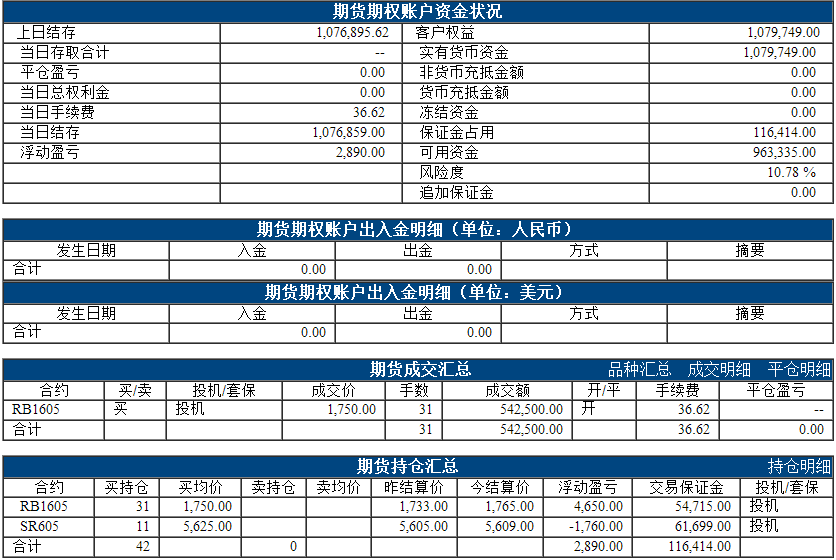 昨日权益:1074695.62元 今日权益:1079749.00元 以下表格为最近一个交易日的资金、成交、持仓情况,若需看之前的,请点击分页 阿超投资账户12月29日资金权益 以上数据来源于保证金监控中心 责任编辑:李婷 |