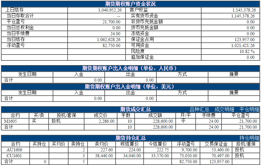 今日权益:1145378.26元 昨日权益:1135652.26元 以下表格为最近一个交易日的资金、成交、持仓情况,若需看之前的,请点击分页 阿超投资账户11月24日资金权益 以上数据来源于保证金监控中心 责任编辑:李婷 |