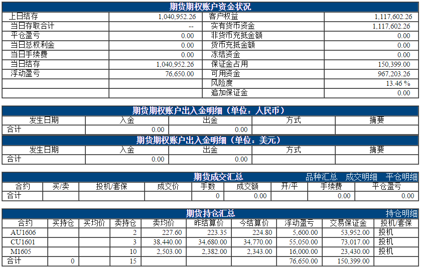 今日权益:1117602.26元 昨日权益:1117952.26元 以下表格为最近一个交易日的资金、成交、持仓情况,若需看之前的,请点击分页 阿超投资账户11月20日资金权益 以上数据来源于保证金监控中心 责任编辑:李婷 |