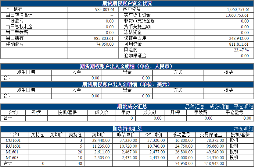 今日权益:1060753.61元 昨日权益:1066027.61元 以下表格为最近一个交易日的资金、成交、持仓情况,若需看之前的,请点击分页 阿超投资账户11月12日资金权益 以上数据来源于保证金监控中心 责任编辑:李婷 |