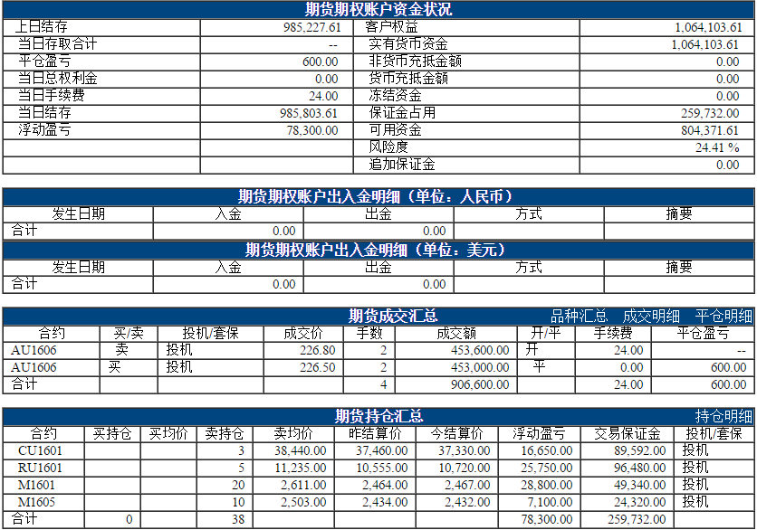 昨日权益:1064103.61元 今日权益:1066027.61元 以下表格为最近一个交易日的资金、成交、持仓情况,若需看之前的,请点击分页 阿超投资账户11月11日资金权益 以上数据来源于保证金监控中心 责任编辑:李婷 |
