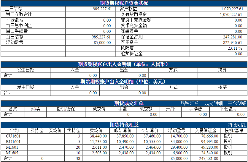 今日权益:1070227.61元 昨日权益:1066027.61元 以下表格为最近一个交易日的资金、成交、持仓情况,若需看之前的,请点击分页 阿超投资账户11月10日资金权益 以上数据来源于保证金监控中心 责任编辑:李婷 |