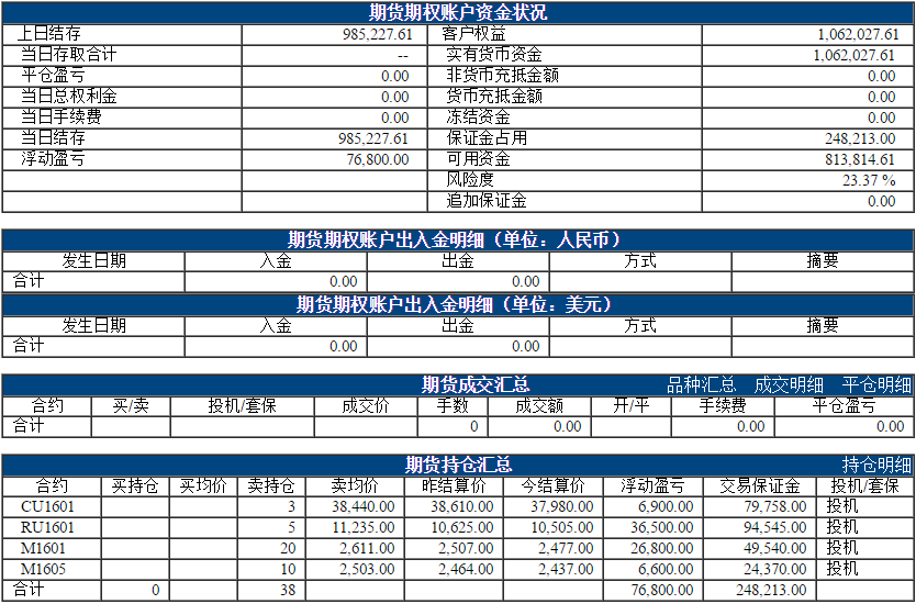 今日权益:1062027.61元 昨日权益:1037877.61元 以下表格为最近一个交易日的资金、成交、持仓情况,若需看之前的,请点击分页 阿超投资账户11月6日资金权益 以上数据来源于保证金监控中心 责任编辑:李婷 |