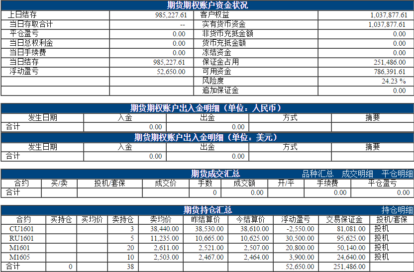 昨日权益:1033977.61元 今日权益:1037877.61元 以下表格为最近一个交易日的资金、成交、持仓情况,若需看之前的,请点击分页 阿超投资账户11月5日资金权益 以上数据来源于保证金监控中心 责任编辑:李婷 |