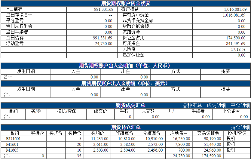 今日权益:1016081.69元 昨日权益:1018281.69元 以下表格为最近一个交易日的资金、成交、持仓情况,若需看之前的,请点击分页 阿超投资账户10月29日资金权益 以上数据来源于保证金监控中心 责任编辑:李婷 |