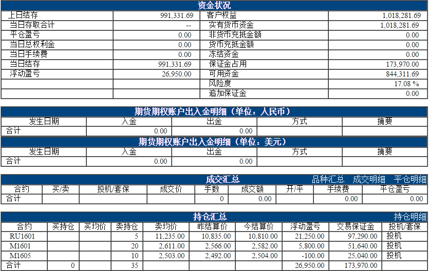 昨日权益:1021431.69元 今日权益:1018281.69元 以下表格为最近一个交易日的资金、成交、持仓情况,若需看之前的,请点击分页 阿超投资账户10月28日资金权益 以上数据来源于保证金监控中心 责任编辑:李婷 |