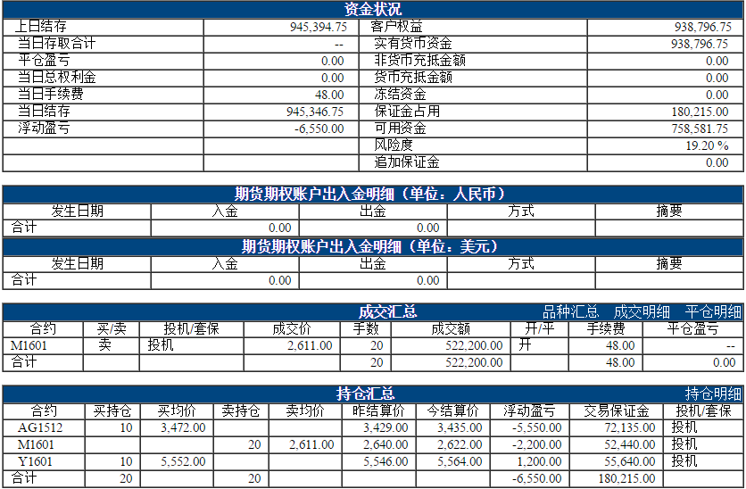 今日权益:938796.75元 昨日权益:938344.75元 以下表格为最近一个交易日的资金、成交、持仓情况,若需看之前的,请点击分页 阿超投资账户10月21日资金权益 以上数据来源于保证金监控中心 责任编辑:李婷 |