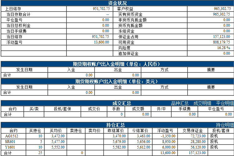 昨日权益:964502.75元 今日权益:965302.75元 以下表格为最近一个交易日的资金、成交、持仓情况,若需看之前的,请点击分页 阿超投资账户10月13日资金权益 以上数据来源于保证金监控中心 责任编辑:李婷 |