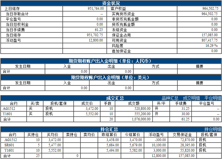 今日权益:964502.75元 昨日权益:962114.00元 以下表格为最近一个交易日的资金、成交、持仓情况,若需看之前的,请点击分页 阿超投资账户10月12日资金权益 以上数据来源于保证金监控中心 责任编辑:李婷 |