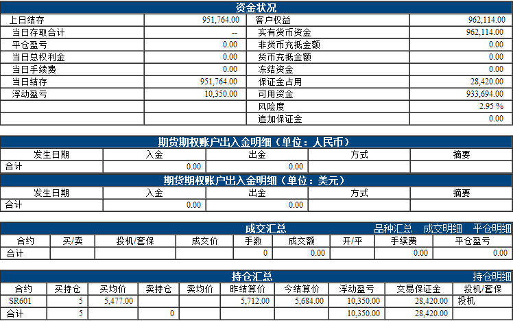 昨日权益:963514.00元 今日权益:962114.00元 以下表格为最近一个交易日的资金、成交、持仓情况,若需看之前的,请点击分页 阿超投资账户10月9日资金权益 以上数据来源于保证金监控中心 责任编辑:李婷 |
