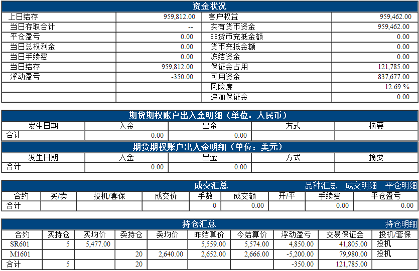 昨日权益:961512.00元 今日权益:959462.00元 以下表格为最近一个交易日的资金、成交、持仓情况,若需看之前的,请点击分页 阿超投资账户9月30日资金权益 以上数据来源于保证金监控中心 责任编辑:李婷 |