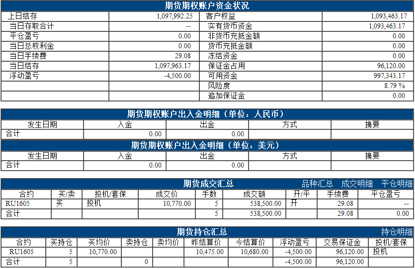 昨日权益:1097992.25元 今日权益:1093463.17元 以下表格为最近一个交易日的资金、成交、持仓情况,若需看之前的,请点击分页 阿超投资账户12月22日资金权益 以上数据来源于保证金监控中心 责任编辑:李婷 |
