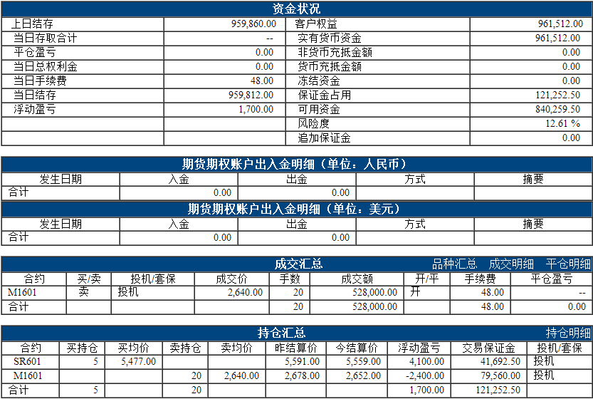 今日权益:961512.00元 昨日权益:965560.00元 以下表格为最近一个交易日的资金、成交、持仓情况,若需看之前的,请点击分页 阿超投资账户9月29日资金权益 以上数据来源于保证金监控中心 责任编辑:李婷 |