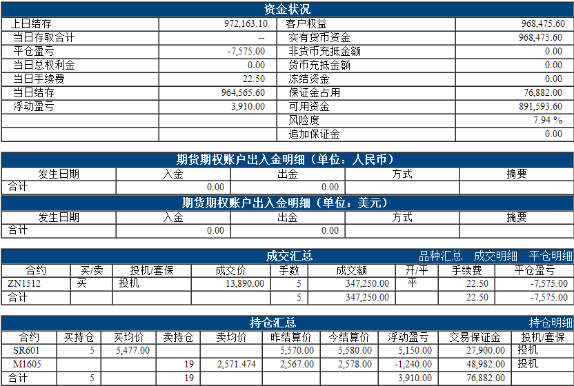 今日权益:968475.60元 昨日权益:976338.10元 以下表格为最近一个交易日的资金、成交、持仓情况,若需看之前的,请点击分页 阿超投资账户9月25日资金权益 以上数据来源于保证金监控中心 责任编辑:李婷 |
