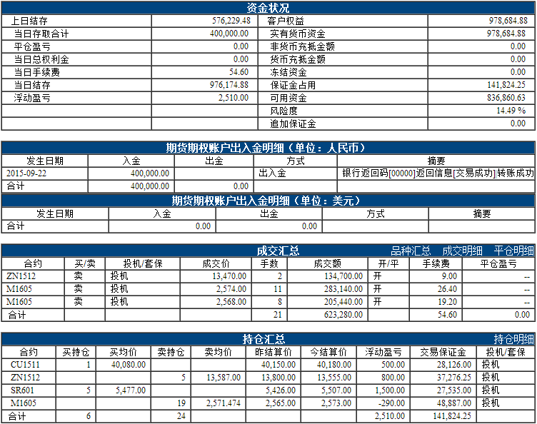 昨日权益:576229.48元 今日权益:978684.88元 今日入金:400000.00元 以下表格为最近一个交易日的资金、成交、持仓情况,若需看之前的,请点击分页 阿超投资账户9月22日资金权益 以上数据来源于保证金监控中心 责任编辑:李婷 |