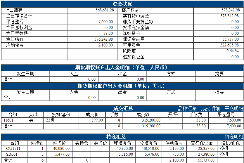 昨日权益:587381.28元 今日权益:578342.98元 以下表格为最近一个交易日的资金、成交、持仓情况,若需看之前的,请点击分页 阿超投资账户9月15日资金权益 以上数据来源于保证金监控中心 责任编辑:李婷 |