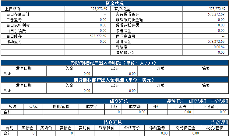 昨日权益:573272.69元 今日权益:573272.69元 以下表格为最近一个交易日的资金、成交、持仓情况,若需看之前的,请点击分页 阿超投资账户8月31日资金权益 以上数据来源于保证金监控中心 责任编辑:李婷 |