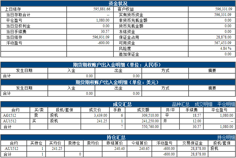 昨日权益:603621.66元 今日权益:596331.09元 以下表格为最近一个交易日的资金、成交、持仓情况,若需看之前的,请点击分页 阿超投资账户8月24日资金权益 以上数据来源于保证金监控中心 责任编辑:李婷 |