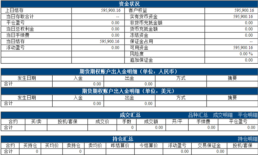 今日权益:595900.16元 昨日权益:595900.16元 以下表格为最近一个交易日的资金、成交、持仓情况,若需看之前的,请点击分页 阿超投资账户8月19日资金权益 以上数据来源于保证金监控中心 责任编辑:李婷 |