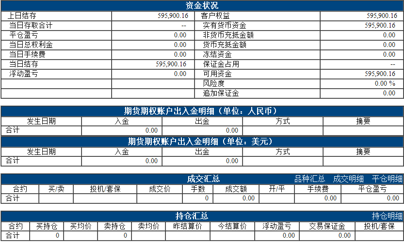 昨日权益:595900.16元 今日权益:595900.16元 以下表格为最近一个交易日的资金、成交、持仓情况,若需看之前的,请点击分页 阿超投资账户8月18日资金权益 以上数据来源于保证金监控中心 责任编辑:李婷 |