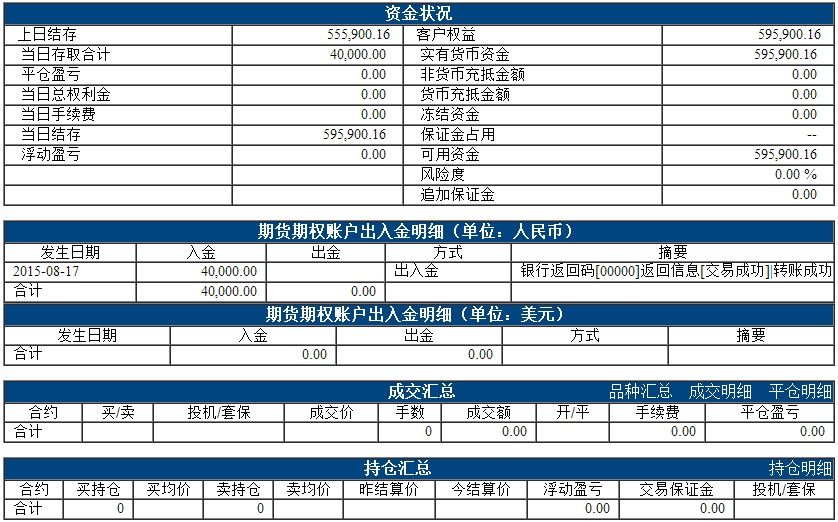 今日权益:595900.16元 昨日权益:555900.16元 以下表格为最近一个交易日的资金、成交、持仓情况,若需看之前的,请点击分页 阿超投资账户8月17日资金权益 以上数据来源于保证金监控中心 责任编辑:李婷 |