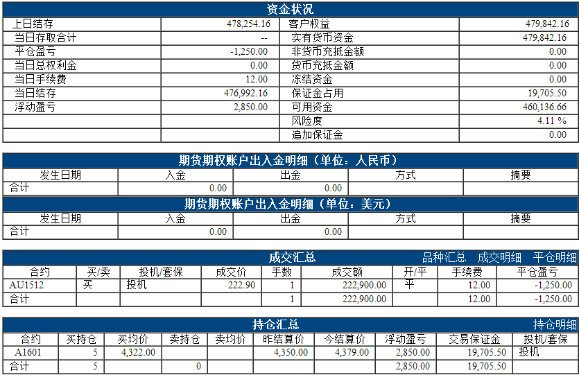 昨日权益:480554.16元 今日权益:479842.16元 以下表格为最近一个交易日的资金、成交、持仓情况,若需看之前的,请点击分页 阿超投资账户8月11日资金权益 以上数据来源于保证金监控中心 责任编辑:李婷 |