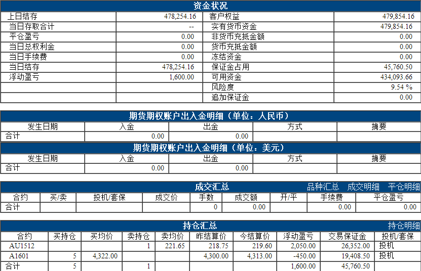 昨日权益:480054.16元 今日权益:479854.16元 以下表格为最近一个交易日的资金、成交、持仓情况,若需看之前的,请点击分页 阿超投资账户8月7日资金权益 以上数据来源于保证金监控中心 责任编辑:李婷 |