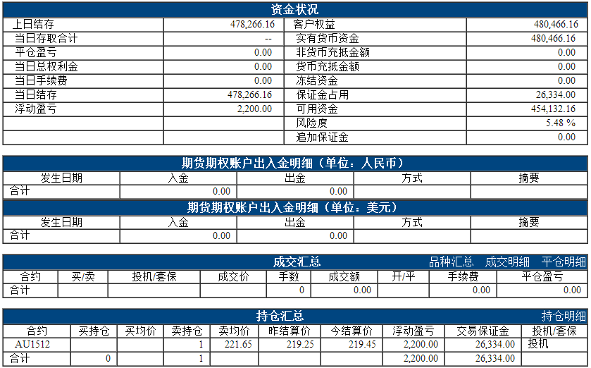 昨日权益:480666.16元 今日权益:480466.16元 以下表格为最近一个交易日的资金、成交、持仓情况,若需看之前的,请点击分页 阿超投资账户8月5日资金权益 以上数据来源于保证金监控中心 责任编辑:李婷 |