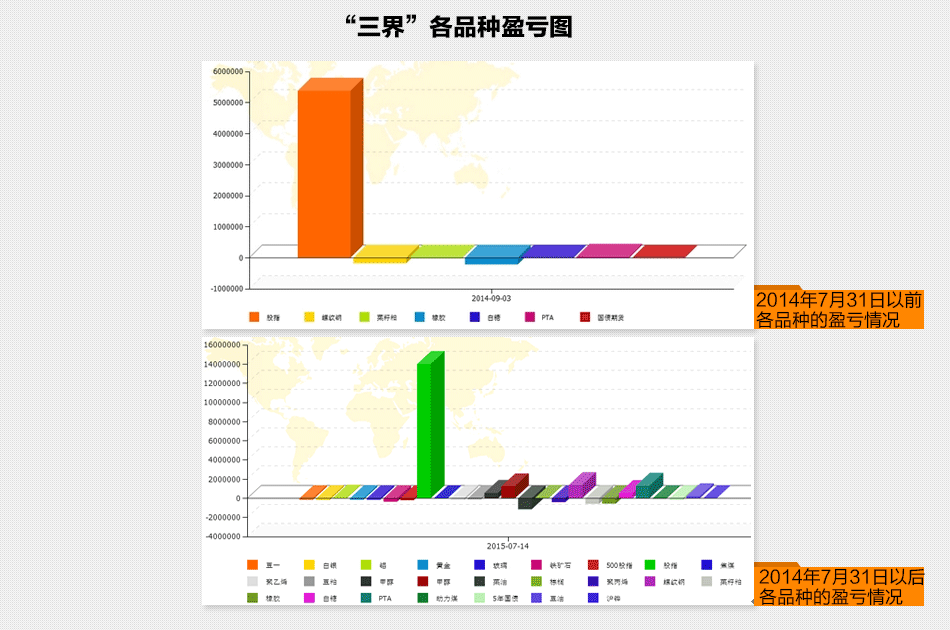 对比了两张品种盈亏图,在做账户分析的时候(2014年9月16日),账户盈利最多的三个品种是螺纹钢、焦炭和豆粕;而现在盈利的品种在原来的基础上增加了两个,一个是沪深300期指,还有个是中证500期指。