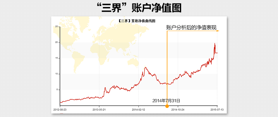 “三界”账户在做账户分析的时候(2014年7月31日)净值为7.09,从上图可以看出,在账户分析后净值屡创新高,目前净值(2015年7月14日)为16.67。