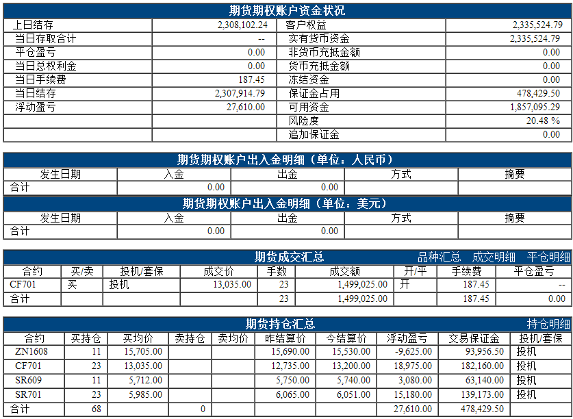今日权益:2335524.79元 昨日权益:2329857.24元 以下表格为最近一个交易日的资金、成交、持仓情况,若需看之前的,请点击分页 阿超投资账户6月17日资金权益 以上数据来源于保证金监控中心 责任编辑:翁建平 |