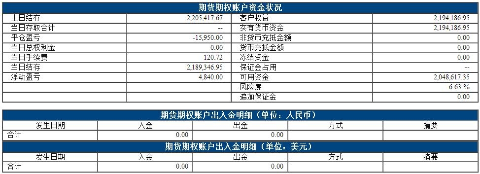 今日权益:2194186.95元 昨日权益:2195667.67元 以下表格为最近一个交易日的资金、成交、持仓情况,若需看之前的,请点击分页 阿超投资账户5月17日资金权益 以上数据来源于保证金监控中心 责任编辑:翁建平 |