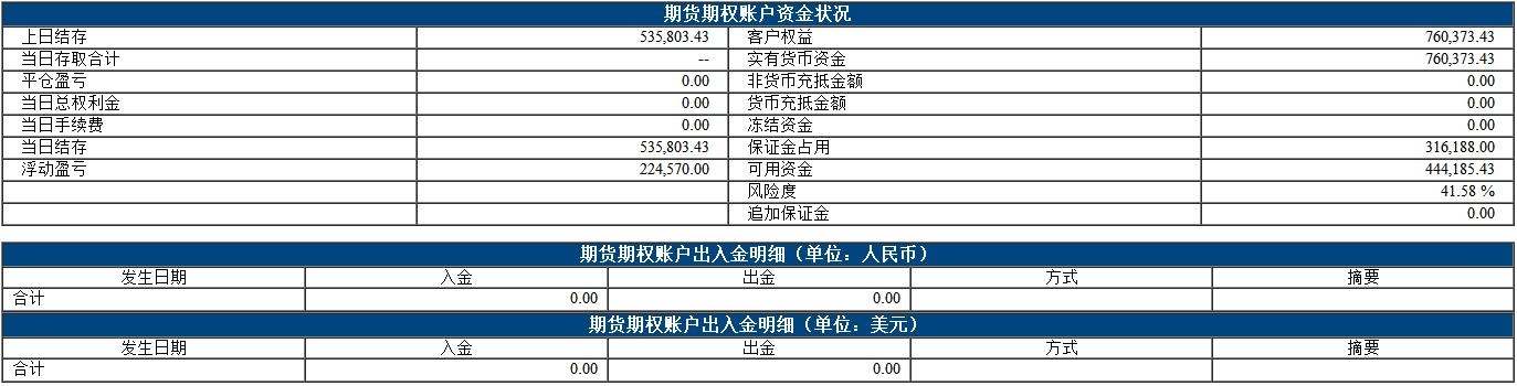 今日权益:760343.43元 昨日权益:638837.43元 以下表格为最近一个交易日的资金、成交、持仓情况,若需看之前的,请点击分页 阿超投资账户5月15日资金权益 以上数据来源于保证金监控中心 责任编辑:翁建平 |