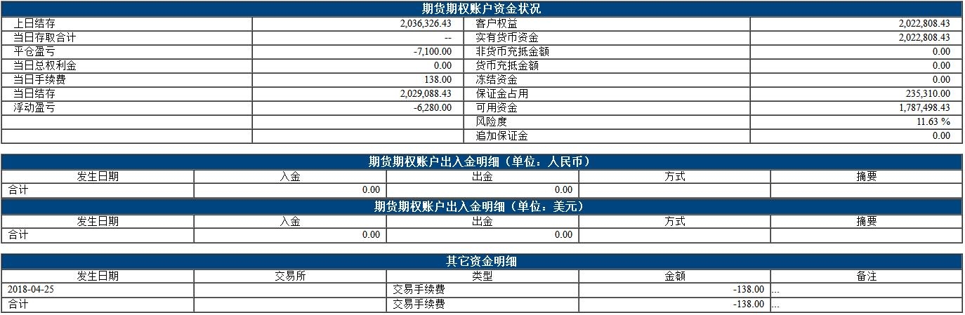 今日权益:2022808.43元 昨日权益:2033026.43元 以下表格为最近一个交易日的资金、成交、持仓情况,若需看之前的,请点击分页 阿超投资账户4月25日资金权益 以上数据来源于保证金监控中心 责任编辑:翁建平 |