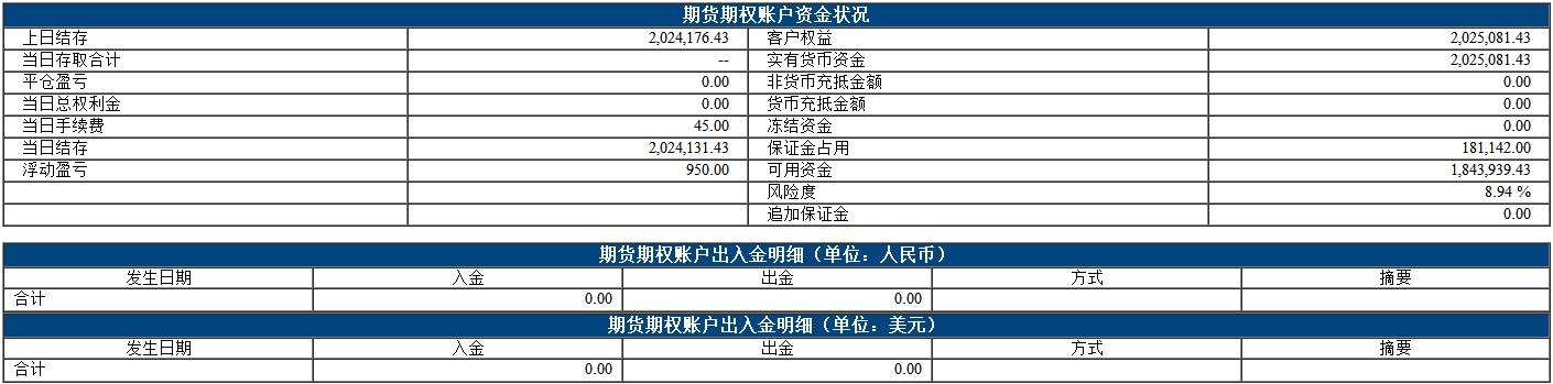 今日权益:2025081.43元 昨日权益:2019276.43元 以下表格为最近一个交易日的资金、成交、持仓情况,若需看之前的,请点击分页 阿超投资账户4月18日资金权益 以上数据来源于保证金监控中心 责任编辑:翁建平 |
