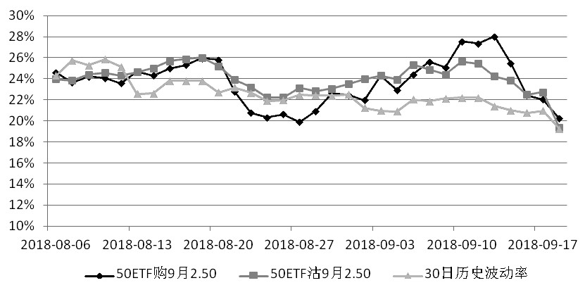 图为9月平值期权隐含波动率走势 昨日当月合约成交量增加64.47万张,认购增加39.06万张,认沽增加25.42万张。持仓方面,当月合约减持13.59万张,认购减持10.02万张,认沽减持3.57万张。结合当月合约各执行价数据看,认购全面减持,特别是在平值附近几档。认沽期权在2.30至2.40价位减持,在2.45及2.50价位增持。持仓结构表明,50指数支撑位上移同时,上行压力降低,指数仍有一定上行空间。 波动率方面,平值期权隐含波动率继续回落,目前已连续回落5个交易日。特别是认购期权,从前期28%回落至当前20%,降幅28.6%。认沽目前19.35%,两者与30日历史波动率20.33%相差不大。认购交投更为活跃,波动率曲线更为规则,高执行价位波动率偏高。 综合来看,建议投资者仍保持振荡思路,可逢高卖出当月虚值认购合约。 责任编辑:七禾编辑 |
