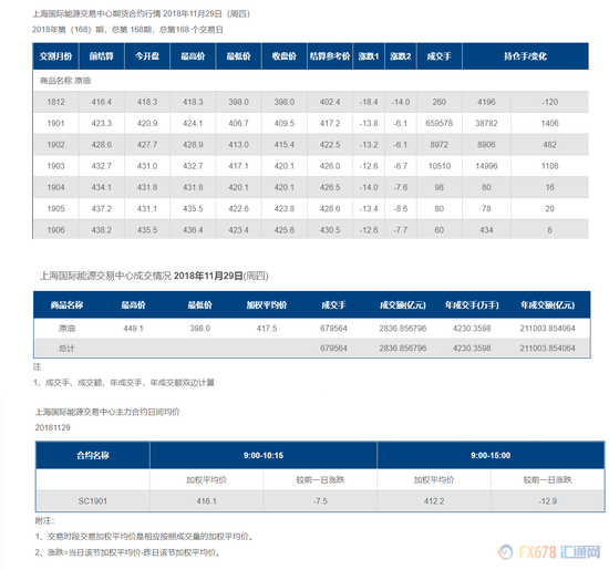 交易综述 上海原油价格下跌。主力合约SC1901,以409.5元/桶收盘,下跌13.8元,跌幅为3.26%。全部合约成交679564手,持仓增加2924手至67686手。主力合约成交659578手,持仓量增加1406手至38782手。 期货合约和成交情况一览