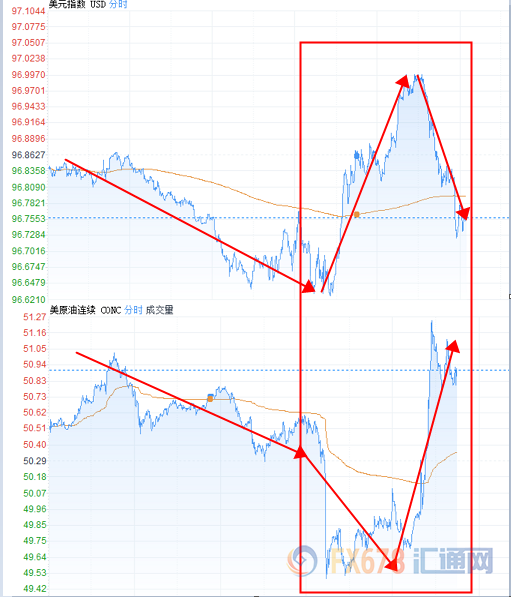 从今日的价差来看,美原油期限价差有走强的迹象,暗示今日近月合约的交投情绪有所上升,但是考虑到此前INE原油也出现过基差走强的迹象,因此不能够说明油价将迎来转势。不过如果未来几个交易日,INE原油以及布伦特原油都开始出现基差走强的情况,则意味着市场的做多情绪开始进一步好转,可能会推动油价的反弹。 不过预计当前偏震荡的走势将维持到OPEC会议之前。 信达期货分析师给出的建议根据CFTC持仓给出的观点是WTI原油期货和期权基金净多持仓连续10周下降,但降幅明显收窄,WTI原油基金净多头持仓仅为5.47亿桶,不到9月底近期峰值的一半。目前油价对预期的反应较为充分,继续大跌的概率不大,反弹仍待时机,若本周末的G20峰会上提前释放减产信号,则会对油价形成较强支撑,目前很难确定油价底部,受政治因素尤其是美国方面的表态影响较大。 美元指数和油价反向关系 关于美元指数和原油价格的反向关系,这是一个近期多次提及的观点。 ![]() 尽管昨日美元和油价同时出现了大跌,但是依然维持这个观点。 因此美元走弱是由于美联储主席鲍威尔的鸽派言论,而美油则是由于原油库存连续十周增加,短线美元和油价都是对数据做了直观的反映,两者的反向关系短时间有所弱化。 从两者的分时图可以看出,经过亚市早盘的修复性走势后,美元和原油的走势再次呈现出较为明显的反向关系,因此在没有重大事件的影响下,两者的反向关系依然成立。