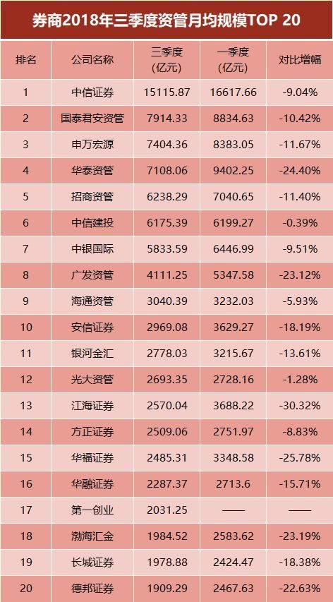 | 至2018年底,包括券商、公募私募、期货等资产管理总规模约50.5万亿元,同比减少了5.78%。其中公募基金规模增长12%,私募资管规模减少近两成。 资管新规及配套细则相继落地,券商资管整体处于整改存量、发行增量的过程。截至2018年年底,证券公司及其子公司资管规模为13.4万亿元,较2017年底缩水了20.24%。 华泰证券研报表示,2018年资管新规落地,打破刚性兑付,规范资金池业务,引导行业去嵌套、去杠杆,对资管行业业态起着重塑的效果,券商资管将实现从“逐量”到“提质”的转变。 2018年底资管总规模50.5万亿,同比减少5.78% 基金业协会昨晚公布了《资产管理业务统计快报(2018年年底)》,初步统计,截至2018年底,基金管理公司及其子公司、证券公司及其子公司、期货公司及其子公司、私募基金管理机构资产管理业务总规模约50.5万亿元(合计中剔除了私募基金顾问管理类产品与私募资管计划重复部分)。这一规模,相较2017年年底的资管业务总规模缩水了5.78%。 截至2018年底,公募基金管理机构管理的公募基金5629只,份额12.9万亿元,规模约13.0万亿元。这一年里,公募基金数量增加了16.28%,规模增长了12.07%。 此外,截至去年年底,私募资产管理计划规模总计约24.9万亿元,相较17年年底规模减少了19.42%。其中,期货公司及其子公司资产管理业务规模下降幅度最大,减少了37.55%。 具体而言,证券公司及其子公司资管规模13.4万亿元(含证券公司私募子公司私募基金),基金管理公司资管规模6.0万亿元(含养老金),基金子公司资管规模5.3万亿元,期货公司及其子公司资产管理业务规模1249亿元。 据基金业协会公布的数据,截至2018年11月底,证券公司资管管理规模主要集中在100—2000亿元,基金公司资管管理规模主要集中在0—300亿元,基金子公司资管管理规模主要集中在0—300亿元,期货公司资管管理规模主要集中在0—5亿元。 另外,在协会已登记私募基金管理人24448家,管理私募基金74642只,规模12.8万亿元,其中私募证券投资基金(含顾问管理)约2.2万亿元,私募股权、创投基金8.6万亿元。 券商资管规模13.4万亿,同比减少两成 资管新规及配套细则相继落地,券商资管整体处于整改存量、发行增量的过程。截至2018年年底,证券公司及其子公司资管规模为13.4万亿元(含证券公司私募子公司私募基金),这个规模较2017年年底的16.8万亿元,缩水了20.24%。 2016年以来监管层出台的一系列降杠杆、去通道等政策,引导券商资管提升主动投资能力,行业回归本源。券商资管规模连年缩水,从2016年末到2018年末,两年间券商资管规模缩水了4.18万亿。 至2018年三季度末,券商资管规模为14.18万亿元,其中月均管理规模前20的券商资管总规模就达到8.91万元,占比超过六成。除了第一创业一季度资管月均规模无统计数据外,前20的每家券商资管月均规模均在缩水,江海证券资管月均规模缩水幅度超过三成,华泰资管、广发资管、华福证券、渤海汇金、德邦证券等资管月均规模降幅超两成。