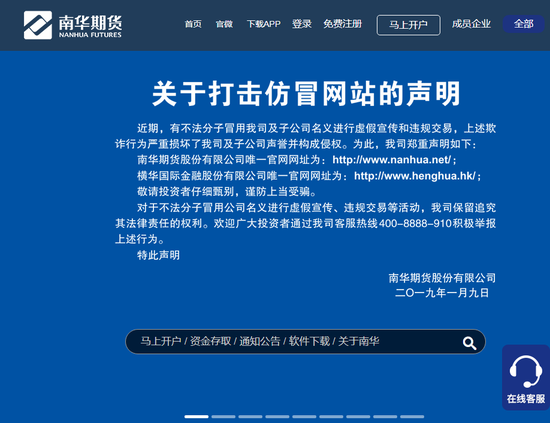 南华期货官方声明 南华期货官方声明:近期又有不法人士冒以我司名义制作假网站如下,希望各位客户朋友辨清我司网址为: www.nanhua.net,以防上当。 责任编辑:刘文强 |