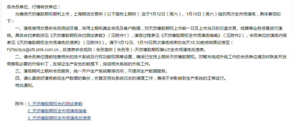 | 上海期货交易所1月9日发布通知称,为确保天然橡胶期权顺利上市,上海期货交易所(以下简称上期所) 定于1月12日(周六)、1月19日(周六)组织两次全市场演练,具体事项如下: 一、演练使用交易所会员测试环境,采用上期所真实会员及客户数据,对天然橡胶期权上市前一日及上市当日的日盘交易、结算等业务场景进行演练。具体合约参数详见《天然橡胶期权合约测试参数》(见附件1),演练过程参见《天然橡胶期权全市场演练指南》(见附件2),会员单位的演练内容参见《天然橡胶期权全市场演练反馈表》(见附件3)。请于1月12日、1月19日两次演练结束的当天18:30前将结果反馈至:FdTecSys@sfit.shfe.com.cn,反馈表命名规则:会员简称(会员号)-天然橡胶期权第x次全市场演练反馈表。 二、请会员单位提前检查相关的技术系统及行权功能权限等设置,确保已支持上期所天然橡胶期权。对暂未完成升级工作的会员单位请及时联系开发商索取必要的升级补丁,在保证生产安全的前提下,完成相关系统的升级工作。 三、演练期间上期所会员服务、统一开户生产系统暂停访问,不提供生产数据服务。 四、请认真做好演练前后生产数据的备份,恢复及柜台系统日志的清理工作,确保不会影响到生产系统的正常运行。