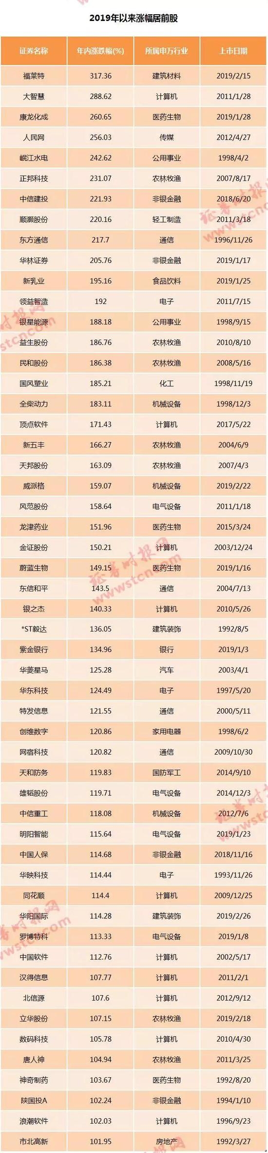 上述策略观点指出,正常的市场温度在43度左右,异常高温位于90度以上,异常低温位于10度以下。以Wind全A指数为例,2000年以来的所有样本当中,温度的中位数约是43度(42.6),有55%的样本落在20度到70度之间,23%的样本在20度以下,22%的样本在70度以上。其把最高的10%样本和最低的10%样本作为异常高温样本和异常低温样本,对应异常高温应在90度以上,异常低温应在10度以下。当前Wind全A指数处于异常高温区域。 其认为,今年以来的A股反弹,在1月份呈现估值快速修复的状态,进入2月呈现估值扩张状态,而从2月底以来,估值则呈现加速发散状态。从市场“温度”指标来看,短期亢奋程度可以排入历史前5。 上述策略观点进一步指出,过高的市场温度并不影响中期趋势,但大概率带来短期剧烈波动回调。从各指数情绪“温度”的历史趋势来看,触及“高温”区域后短期内估值往往都有剧烈的波动回调,随后逐步趋于平静,难以持续维持在“高温”区域。 海通证券荀玉根、姚佩等人的最新策略观点则认为,牛市有三个阶段,包括孕育准备期、全面爆发期、泡沫疯狂期,目前市场类似2005年,处于牛市孕育准备期。 荀玉根、姚佩等人的上述策略观点指出,最近一周A股市场继续火热,上证综指、沪深300、创业板指等指数均创年初以来新高,牛市呼声高涨,甚至有人提出上证综指今年能到4000点,而周五市场又出现大幅回调。怎么看待市场火爆及急跌?其维持前期观点,即目前市场处于牛市孕育准备期,市场波动大是这一阶段主要特征。 上述策略观点认为,孕育准备期盈利回落、估值修复。这一阶段宏观基本面仍在下行,企业盈利增速回落筑底中,但宏观政策已偏暖,流动性好转,估值修复推动市场上涨。这个阶段市场进二退一,回吐较大,整体偏震荡,为牛市全面爆发做准备。 其还认为,本次股市抢跑的逻辑主要源自政策红利,2月22日中央政治局会议指出“金融是国家重要的核心竞争力”,并指出要“深化金融供给侧结构性改革”,政治局会议的定调预示着,我国将进入股权融资大时代,大的制度红利助推市场提前见底。 国泰君安李少君、周隆刚的最新策略观点则认为,短期交易集中风险释放,行情上涨主逻辑未改。结构性因素接力周期性因素,后续行情或更多受政策驱动影响。游资主导投资风格,关注高风险特征股票。 李少君、周隆刚策略观点指出,短期交易集中风险累积,偶发事件促发回调。市场浮盈累积,交易拥挤风险有待释放,加上中国2月出口数据较弱,券商发布两份看空报告,影响市场情绪,间接推动了交易拥挤风险的释放。 上述策略观点认为,短期回调并不改行情上涨主逻辑,乐观基调仍在延续。市场上涨的主逻辑、上行结构秩序并没有破坏,市场主体并未因为短期回调产生明显的恐慌情绪扩散。 其一、经济改善预期未被证伪,政策层面降费减税、降低实际利率水平、稳定汽车消费、深化重点领域改革等领域提升经济动能措施可期。其二、从市场行情结构来看,市场在下跌中并未表现出明显的外资定价与科创板定价主线的弱化,并未体现出风险偏好显著下降的迹象;市场热点行业表现显示市场信心仍在,阶段内支撑市场的驱动力仍在继续发力。其三、从下跌主体反应来看,当前市场并未表现出恐慌扩散的态势。融资余额继续上升、散户资金入市积极性显著提升,对冲大体量资金积极性弱化,有利于市场的稳定。 李少君、周隆刚策略观点认为,在当前宏观与市场环境下,涌入的社会资产主要是游资,其特点是偏向高风险特征的股票。从市场结构表现来看,行情驱动逻辑仍在继续,未来表现比较好的仍应该是高风险特征的股票,包括科技类、券商类股票,机构投资者相对更加注重配置逻辑。 02 年内53股仍然翻倍 3月8日,A股市场在连续大幅上涨后迎来年内最大幅度调整,沪指跌幅高达4.40%,当天盘中市场振幅明显加大,200多只个股收盘跌停,两市成交额也创下本轮行情新高,让投资者初步感受到了上涨市中调整的威力。 不过,即便经过上述调整,年内多数股票仍旧涨势显著。 据同花顺iFinD数据,年内仍有53只个股涨幅超过100%,即股价至少实现翻倍,剔除年内一直停牌股票,所有A股涨幅的平均数为25.49%,中位数为20.50%。