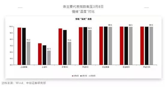 | 在3月8日沪指出现年内最大级别调整后,机构对后市的最新观点备受投资者关注。 这个周末,中信证券秦培景等人在其最新策略观点中,以水温类比,构建了一个 “市场温度指数”,指出当前上证综指/沪深300/中证500/创业板指的“温度”分别达到76度/76度/95度/100度。 按照上述研究策略的观点,目前中证500和创业板指仍处于温度较高的状态。 另一家大型券商海通证券的最新策略观点则认为,目前市场处于牛市孕育准备期,市场波动大是这一阶段的主要特征。 01 多家券商发布最新策略观点 中信证券认为中证500和创业板指温度仍较高 3月8日,沪指出现年内最大幅度调整,超过200股跌停。在此之前,该指数年内总体一路上行,很少出现跌幅超过1%的调整。与此同时,当天的中小创依旧相对强势,创业板指当日跌幅明显小于沪指。 后市是否还有较大机会?这个周末,不少券商机构发布了其最新策略观点。 中信证券秦培景等人在其最新策略观点中,认为股票偏离内在合理价值的速度(上涨的速度)比方向更适合反映市场的亢奋程度,但纯粹用股价涨幅,又会忽略相对合理的内在价值的因素。因此其假定股票价值是内在价值和“投机价值”共同构成的,通过衡量“投机价值”相对于内在价值的相对变动速度,可以大体测量市场情绪的亢奋程度,据此其测算了“投机价值”相对于内在价值的相对变动速度,并将该指标映射到0~100的区间,构建了一个类似水温的“市场温度指数”。 上述策略观点指出,当前上证综指/沪深300/中证500/创业板指的“温度”分别达到76度/76度/95度/100度。